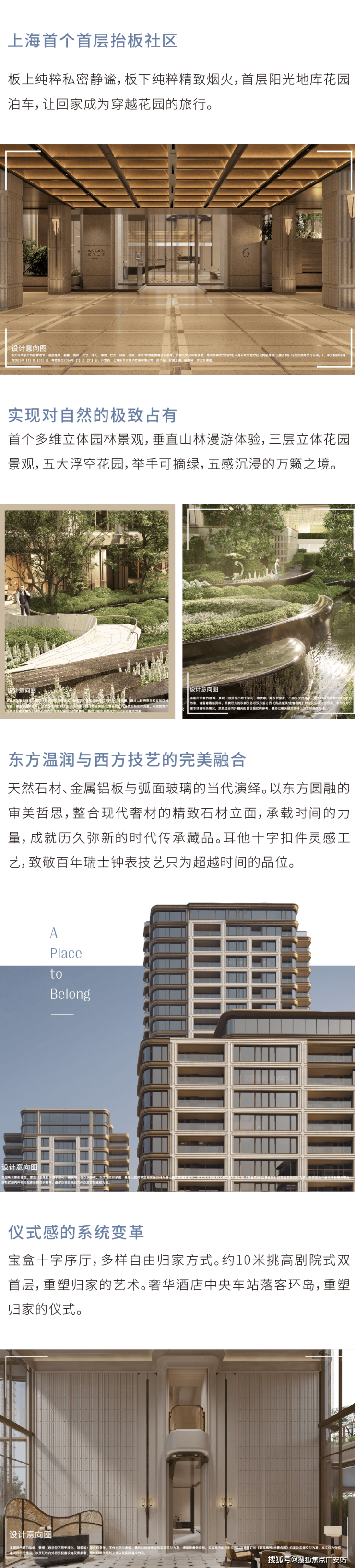 作为上海新规之后首个重点落地项目,安澜上海首创"全域抬板"规划,通过将居住空间整体抬升,创造出动静有序的生活空间。板上,是纯粹私密的住区;板下,是高定丰盛的配套场域。并结合抬板设计所形成的空间条件,构建出多维立体的空中生活场域。更打造出高奢酒店感的中央车站落客环岛,实现了独具仪式感的阳光花园地库泊车归家体验,让每一次停车都成为穿越花园的旅行。