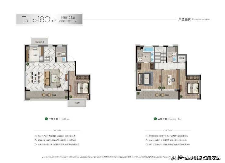 “2+1”层设计,三层阔绰的大横厅连通南向大阳台,一间南向卧室以及厨房、公卫,四层2间主卧,其中主卧不仅南向拥有大尺度阳台,北面穿过衣帽间,推开门即是一片开阔的北露台。闲暇时光可一边浸浴,佐以红酒小酌,一边自在欣赏露台风光,颇有意趣。