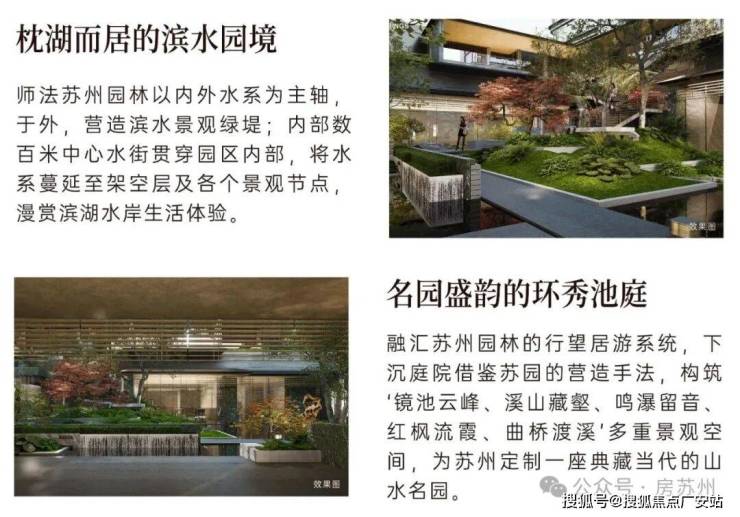 凤起冕旒|东方礼序的当代演绎;主入口门头以古代礼冠“冕旒”为灵感,采用现代设计语汇,构筑约85米“凤起冕旒”华贵门仪。景泰蓝垂幕「旒珠振玉」镶嵌其间,既呼应传统东方礼制,亦致敬苏州的时代封面与源点气质。门庭景观取罗汉松、朴树等珍稀树种,将奢石、水景与自然精巧融合,构筑一方承袭千年盛韵的尊荣之境。