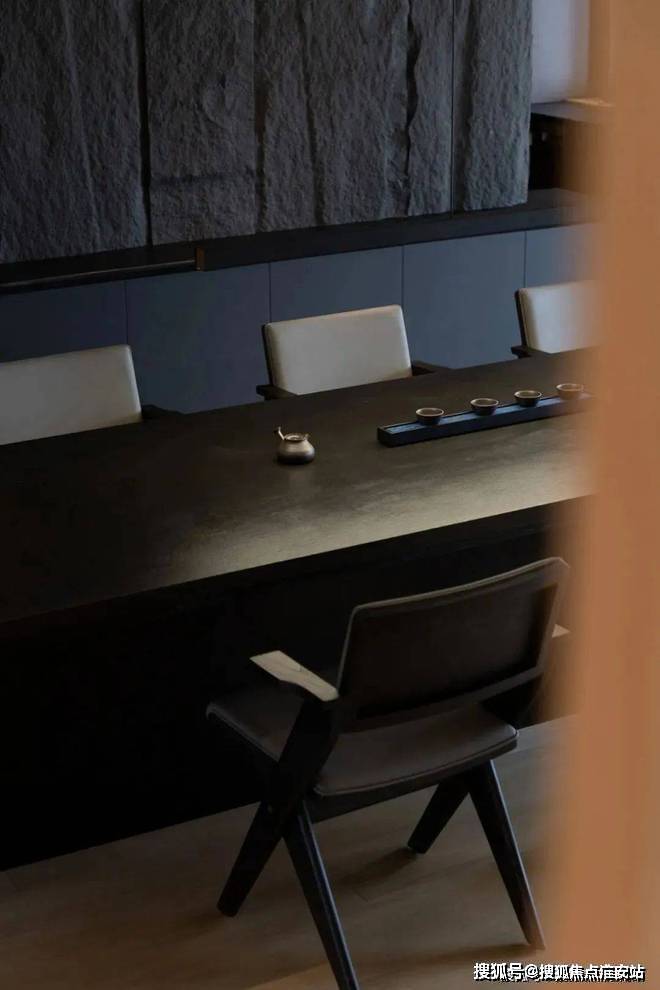 旁侧是料理区,深黑色的台面,搭配斑驳的石质墙面,是如此深邃,具有力量感。