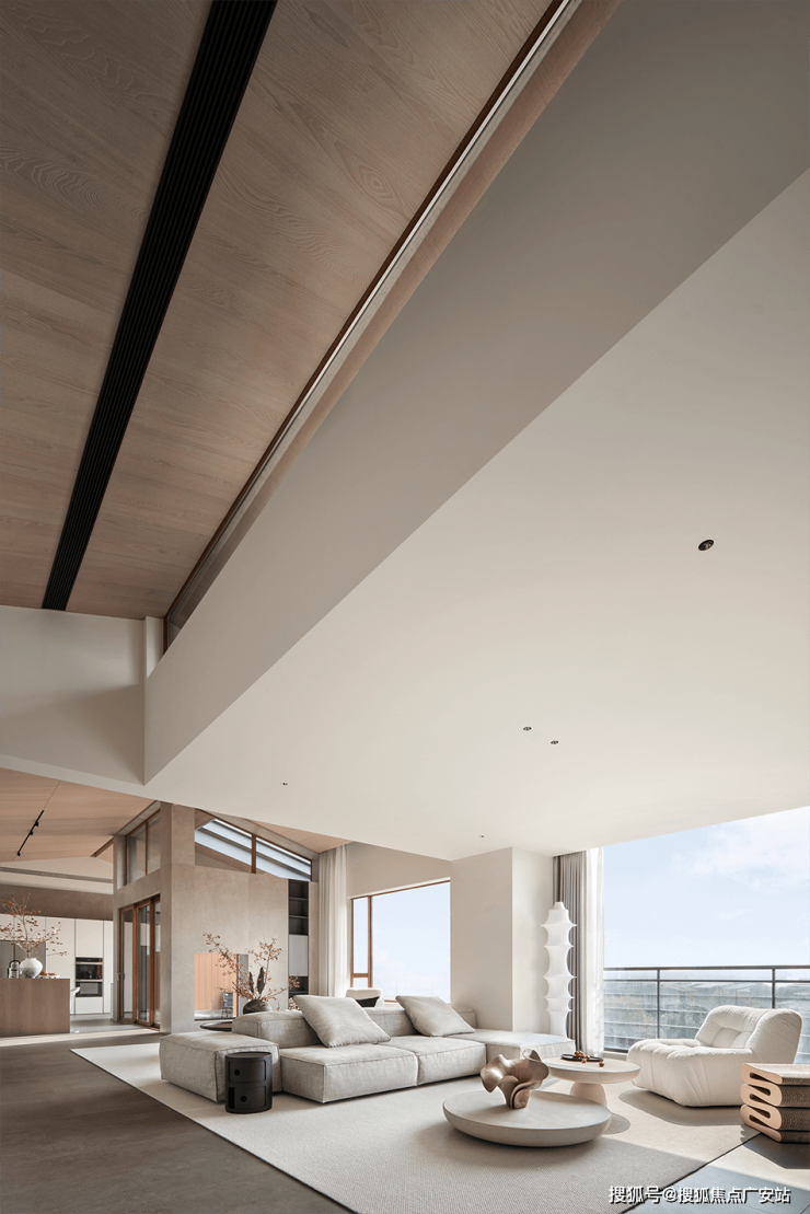 两面式沙发,打造出更随意的坐卧选择与舒适体验。木质吊顶铺展延伸,层次错落有致,仿若将室外的自然意境延伸到了屋内,简雅质朴而温润有加。