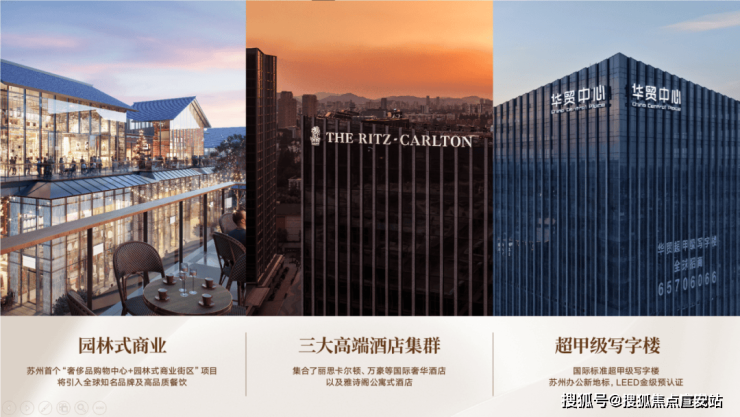 苏州华贸中心择址苏州姑苏区核芯,约78万方地铁上盖城市综合体,规划超甲级写字楼、精品购物中心、园林式商业街区、丽思卡尔顿酒店、万豪行政公寓、雅诗阁服务公寓、华贸姑苏里服务公寓、H+美术馆、紫芝园等多元业态,充分融合东方历史文化与大都市商业文明的精髓,致力于打造全新的江南大都会生活方式.