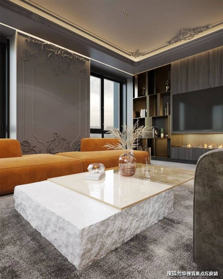 以优雅为主题的客厅空间,一抹亮眼的橙色,打破宁静,为空间注入活力欢快的气息,从天花板一直蔓延到墙面的石膏线条,与抽象艺术摆件,将轻奢气息渲染到极致。