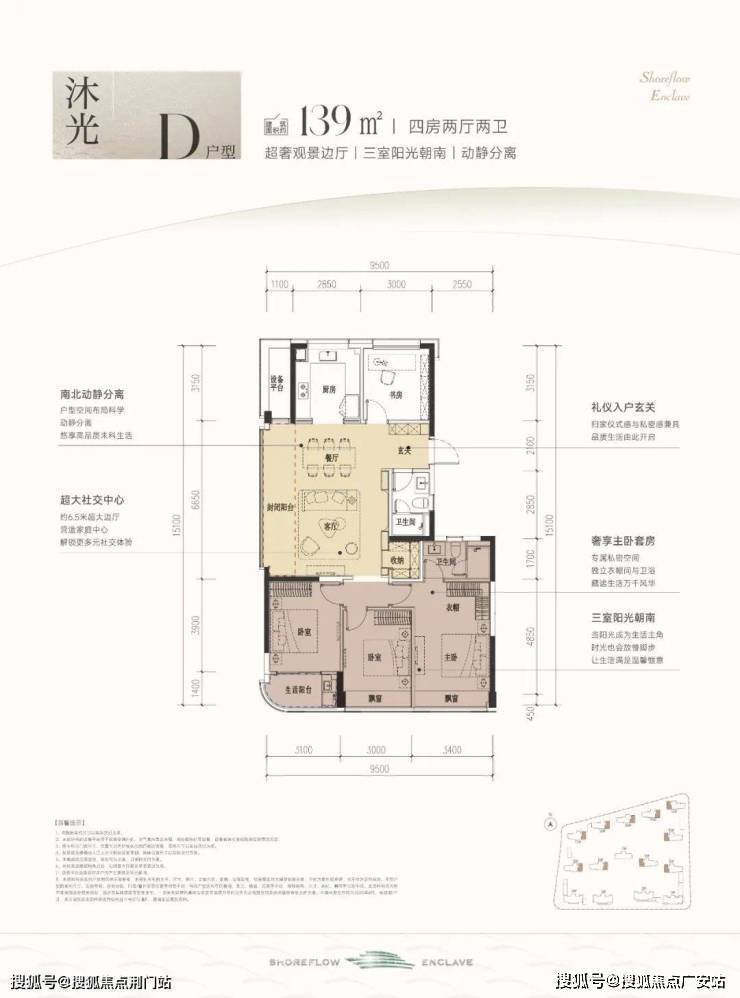 建筑面积约139m²D户型,同样也是四房两厅格局,相比124户型,每套都远离项目南侧主干道,私密性和环境更优,是高净值注重隐私客群的不错选择。南向3面宽,三房朝南阳光充足,家庭成员都有着独立的生活空间。连着约6.5米封闭阳台,可打造多个生活场景。