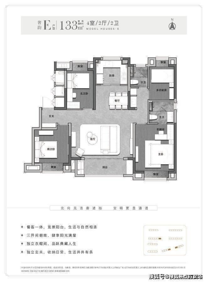 而针对改善型需求的购房者,新长宁·水韵名邸133平米4房的产品设计也可谓量身定制!四叶草布局,使得家庭成员的个人空间互不干扰.而连接超大面宽阳台的客厅,同样与LDK一体化餐客厅打通,给予家人超大尺度的公共交互空间!此外,主卧部分的独立衣帽间设计,则令屋主拥有更尊贵私密的独处空间!