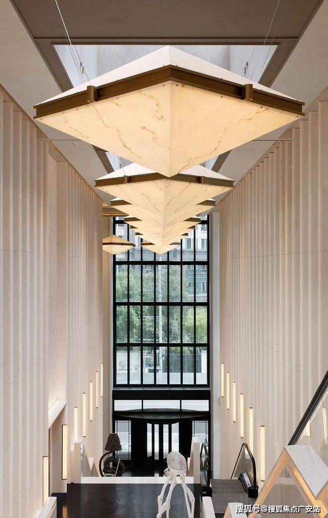 它是中興傲舍的其中一个地面大堂。走进大堂,你看到了一条三层挑空的上升之路,它就像一座圣殿,让你瞬间迸发出艺术意义上的「崇高感」——它是美术馆式的阶梯,与你擦肩而过的,是沐浴着天光的雕塑作品。