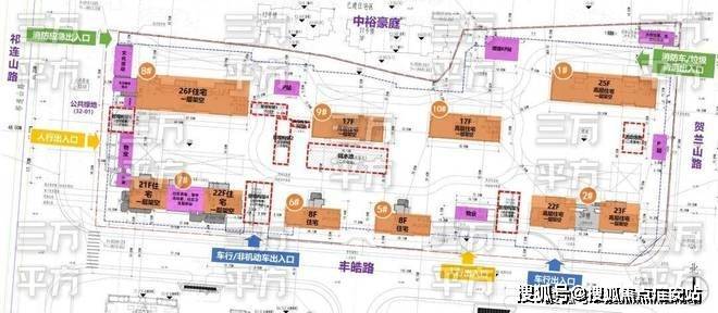 32-04地块的小区人行出入口分别在南侧的丰皓路和西侧祁连山路,消防出入口在贺兰山路和祁连山路,两个车行出入口都在丰皓路上。