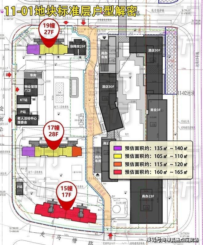 11-01地块,规划的住宅楼有3栋,19#东侧为一栋29F的保障用房。商业区域有2栋30F的酒店、23F的综合楼和2栋3F商业。住宅和商业之间用公共通道(约8m)分隔。