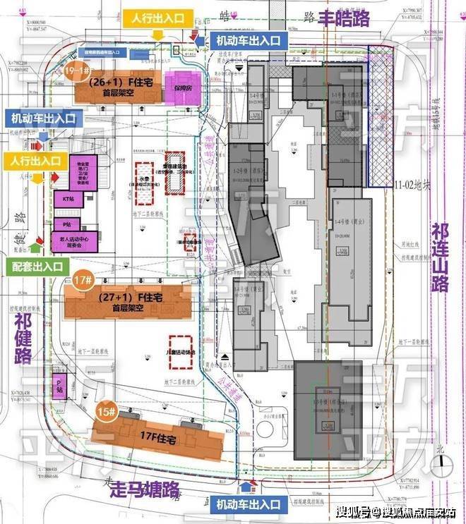 11-01地块一共有6个出入口,丰皓路上分别有1个人行出入口和1个机动车出入口,祁健路上有1个机动车出入口、1个人行出入口和1个配套出入口,走马塘路上仅有1个机动车出入口。
