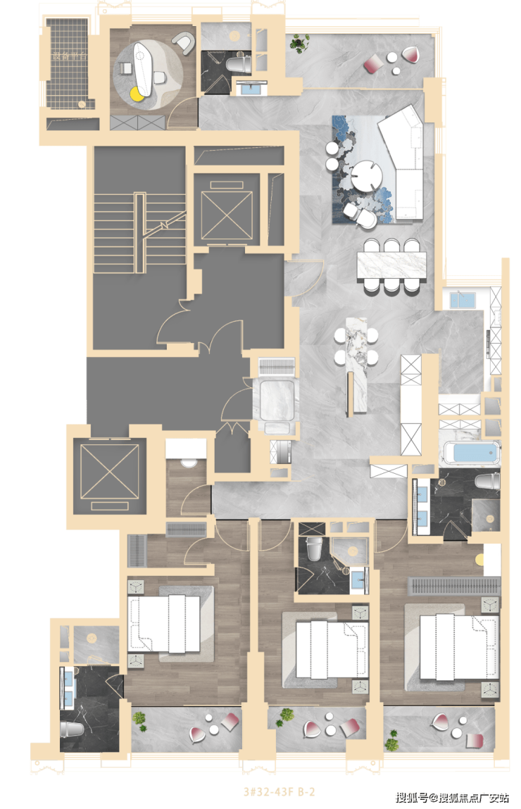 其中3#为超高层,北向可观小区绿化和苏河景观,高区可瞰三件套盛景。