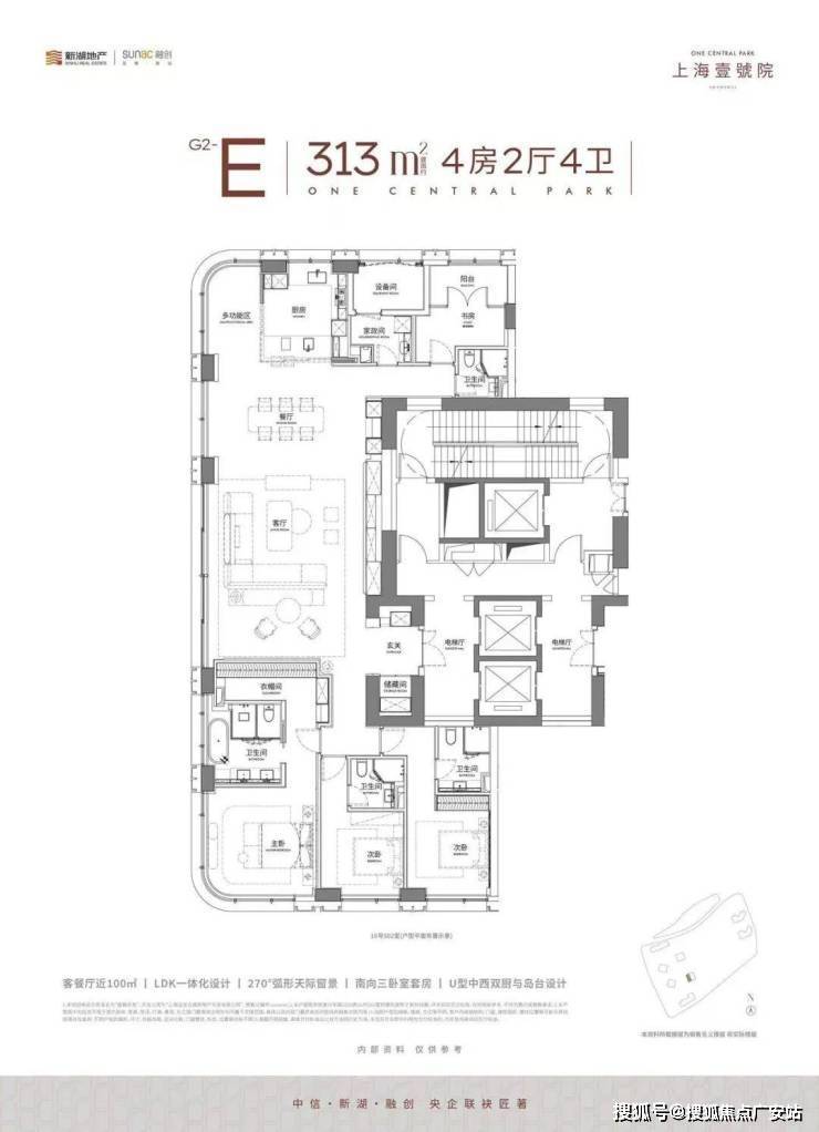 超80%的得房率,LDK一体化厅+西厨岛台,L型大面积转角落地窗,呈现出270度的幕布视野,这个王者公区的尺度不到现场来看,根本是你想象不到的震撼!
