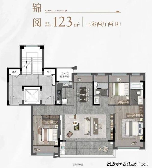 123m²为洋房户型,得房率约在80%+(具体以实际户型为准),3+1房设计、客厅开放式书房,客厅开间约6.7米。