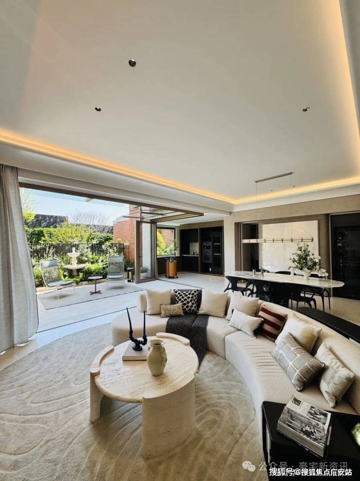 「无界空间」:客厅270度转角无柱设计,搭配落地玻璃,开阔视野将院中风景迎入日常。