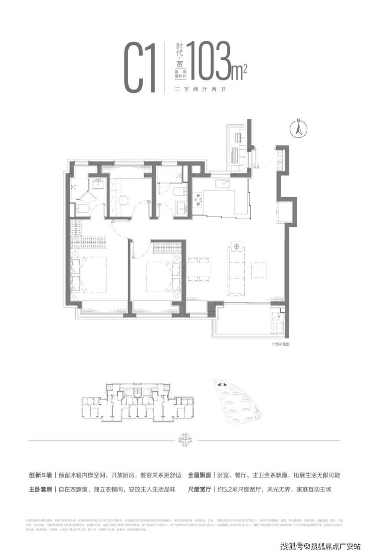建面约103m²三房两厅两卫户型,南北双卧L型270°揽境飘窗设计,更大限度地让自然融入与自在之中,更宽阔的空间尺度,让自在生长与自然之中。