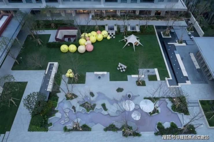 阳光草坪,大面积的平坦开敞绿地塑造了舒适平和的氛围,小朋友可以日常在这里跑跑跳跳释放天性,周末时可以铺上餐布,搭起帐篷来一次露营。