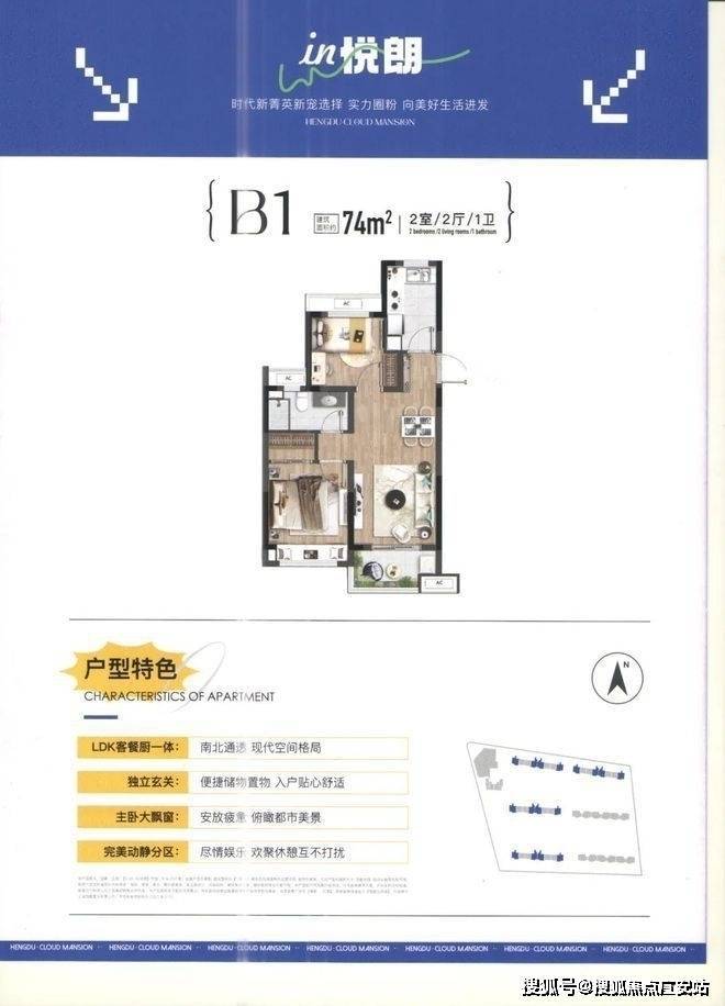 建面约74㎡2房2厅1卫户型图▼恒都·云湾售楼处电话:400-998-7894