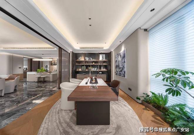 在茶室,设计师选用木美MaxMarko品牌,中式圈椅造型美学辅以天然皮革材质,温润的大理石结合古韵实木,古朴典雅又符合现代美学,在不同材质的碰撞中,探讨当代茶与生活方式的融合。一抹绿意伸展,袅袅烟影落于晴窗,私藏一隅东方雅韵,阅尽书籍的历史厚重感,在茶香与墨香中沉淀生命诗意。