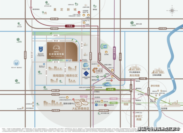 整个南翔板块区位优势明显:距虹桥核心区直线距离约13KM,享受大虹桥强势能级辐射。同时承接虹桥国际开放枢纽北向拓展带重要节点,一脉虹桥发展金线,南翔进阶大虹桥主城生活区,成为中央商务配套区和高品质国际化社区目的地。
