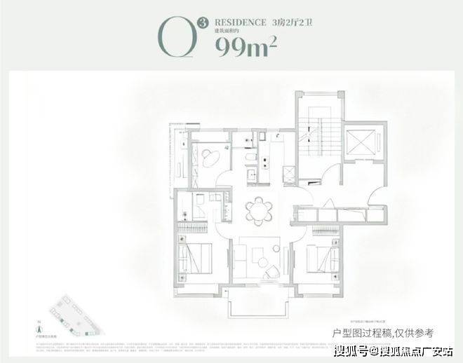 一梯两户,层高3.05米,相当于99竖厅户型的缩小版。南北直通,全卧飘窗,南白整体面宽约9.75米,其中客厅面宽约3.55米,主卧面宽约3.2米
