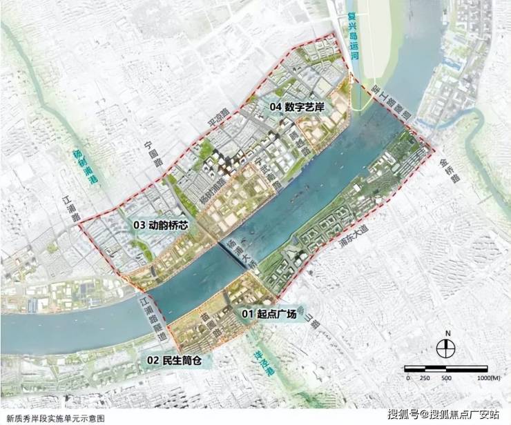 新质秀岸段位于黄浦江两岸贯通段的最北端,北至平凉路、东至军工路隧道、南至浦东大道、西至江浦路隧道。