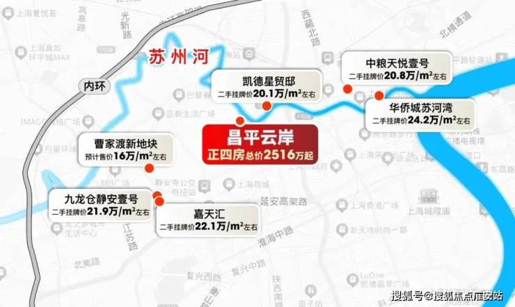 昌平云岸位于寸土寸金的老静安核芯,抱揽苏州河得天独厚的自然景观,享有良好的水岸视野,项目整体地块东高西低,符合堪舆学中青龙抬头,白虎屈服之势。上风上水正位堪舆,藏风聚气,玉带环腰聚财纳瑞,珍藏价值拉满!