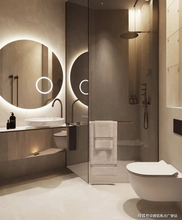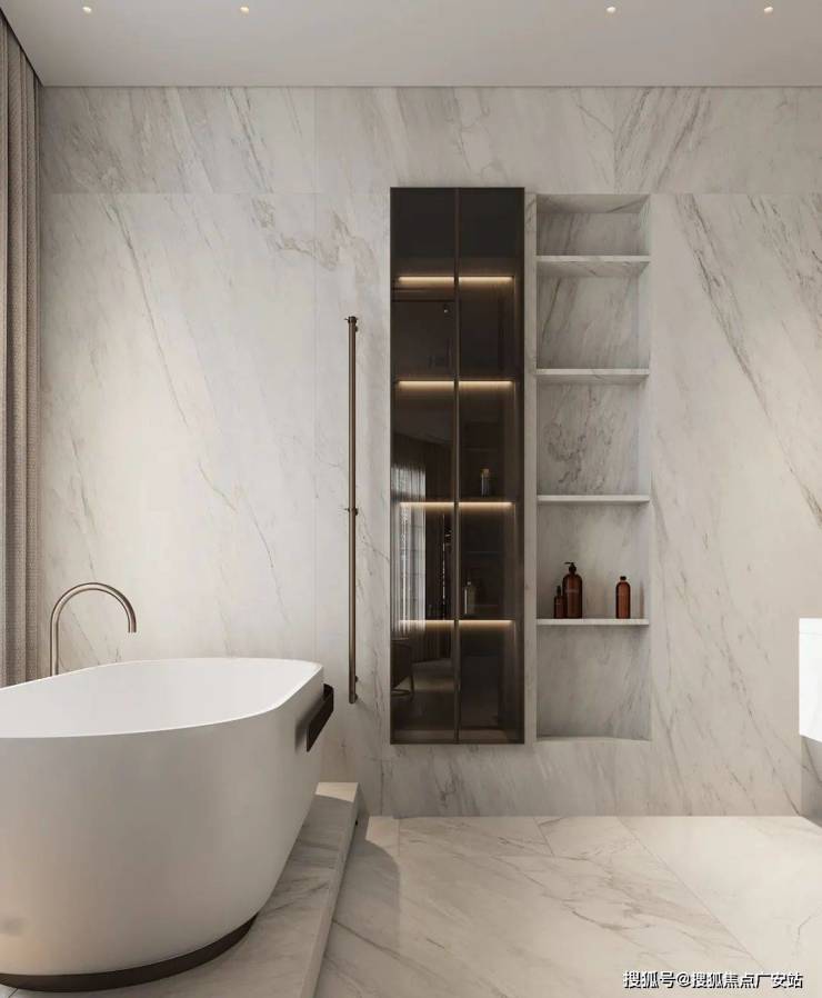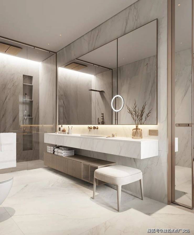 The bathroom expresses the cleanliness of the space through bright light, and the white marble sets off the cleanness and purity of the space, showing a sense of high quality.