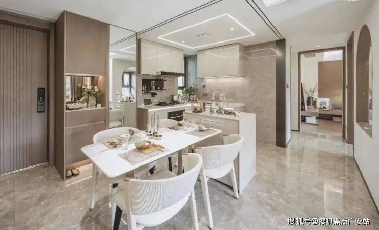 在厨房的设计中依然沿袭客厅的设计采用大理石元素,通过金属元素与大理石元素的结合来表现空间的轻奢,其中金属的岛台加上大理石台面让空间极具氛围感,让空间看上去更有层次。