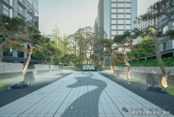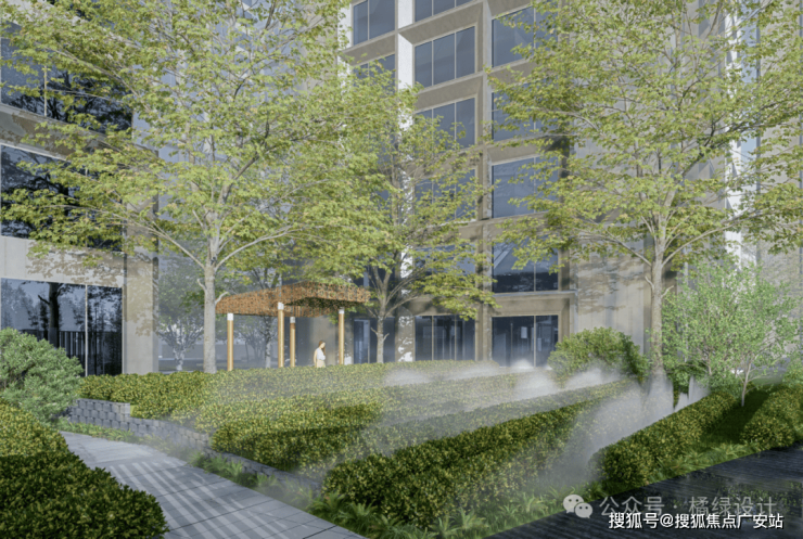 新自然主义,岛式绿化,保留原有大树和非重点区的灌木。新植绿化继续采用新自然主义的岛式绿化。