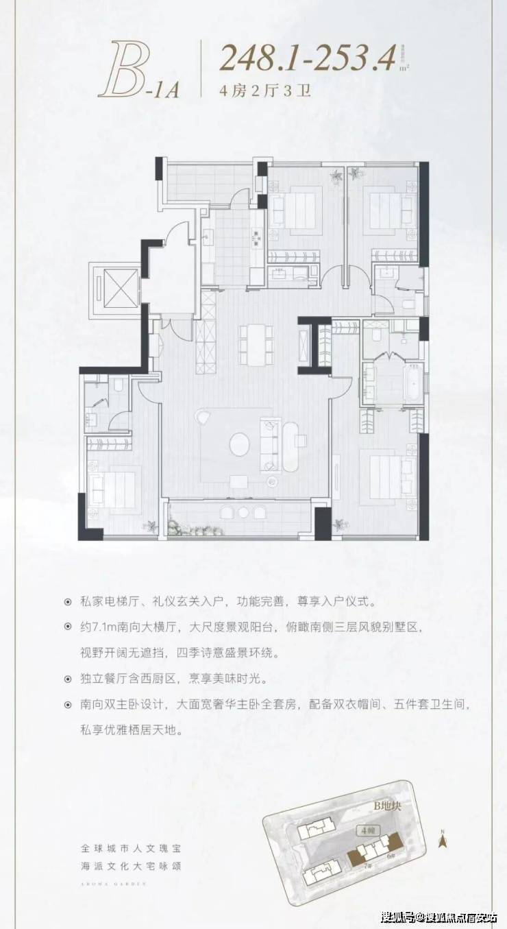 建面约216-254㎡四房(共74套):四叶草布局(四房互不干扰),动静分区,豪华主卧套房(含衣帽间、双台盆浴室、观景飘窗),270°转角边厅(落地玻璃窗),尽揽外滩天际线与园林水景。