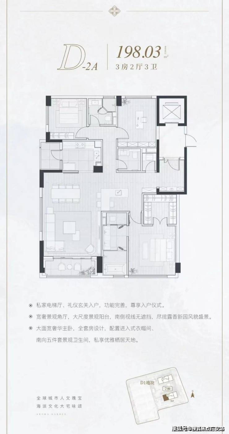 建面约166-213㎡三房(共103套):方正通透,南向四开间采光,LDK一体化设计(客厅、餐厅、厨房贯通),配备中西双厨(中厨+西式岛台),满足三代同堂的舒适需求与社交宴请的体面。