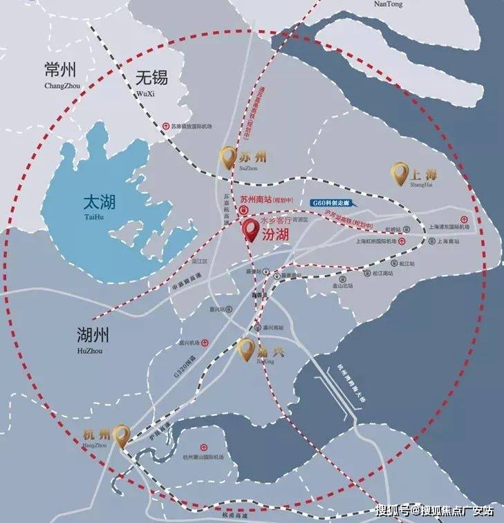 苏州南站距本案约𝟕公里。通苏嘉甬铁路、沪苏湖铁路交汇,未来汾湖前往上海仅𝟐𝟎分钟。