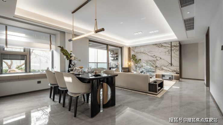 入户玄关设计,设置了一个不小的隐蔽储物间,大大增加了室内的储藏空间,可以将平时不用的闲置物归纳于此。客餐厅阳台一体设计,客厅南连宽景阳台,餐厅南连飘窗,南北通透采光,将生活的奢度打开。