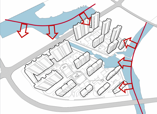 本案着重考虑在保证容积率的前提下,充分兼顾景观空间的均好性。将南侧苏家滃河引入基地,贯穿中部,利用南北向的河道,让住宅享受最大范围的河道景观。此外,社区中心空地作为景观中心,与其余组团空间联结为纵横交错的景观轴线,形成全方位的景观渗透。力图将项目打造成为现代语境下的滨水诗意休闲雅居。