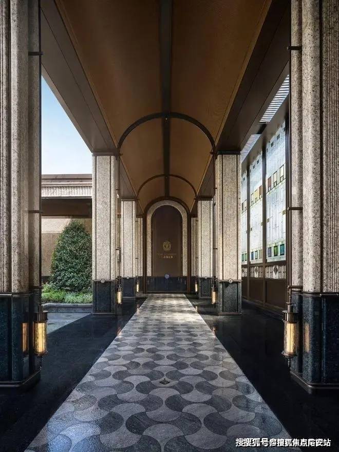 走在约30米的艺术连廊,第一时间想到的就是繁花电视剧里出现过的和平饭店拱形廊道.但建发·海阅首府取其精髓,融合现代工艺重新演绎,更具时尚感.