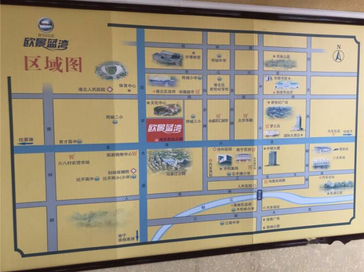 项目位于贵港市港北新区金港大道与迎宾大道交叉口东北角,北面紧邻港北区政府和贵港市文化艺术中心,南面紧接城市主干道金港大道,西面是迎宾大道。随着贵港市城市建设的高速发展,城西板块已成为贵港市的副中心,同时也是贵港市民心目中的CLD(中央生活区)。而欧景蓝湾正处于城西板块的核心腹地,傲居贵港市门户区域,且周边耸立众多城市地标式建筑,如文化艺术中心、体育中心等,有着得天独厚的地理位置与地段优势。 沿金港大道往东,直达马草江公园和新世纪广场,5踏入贵港市行政、商业、休闲中心,交通十分便利。目前有5路、10路、15路公交车到达贵港各个方位,正所谓出则闹,入则雅。