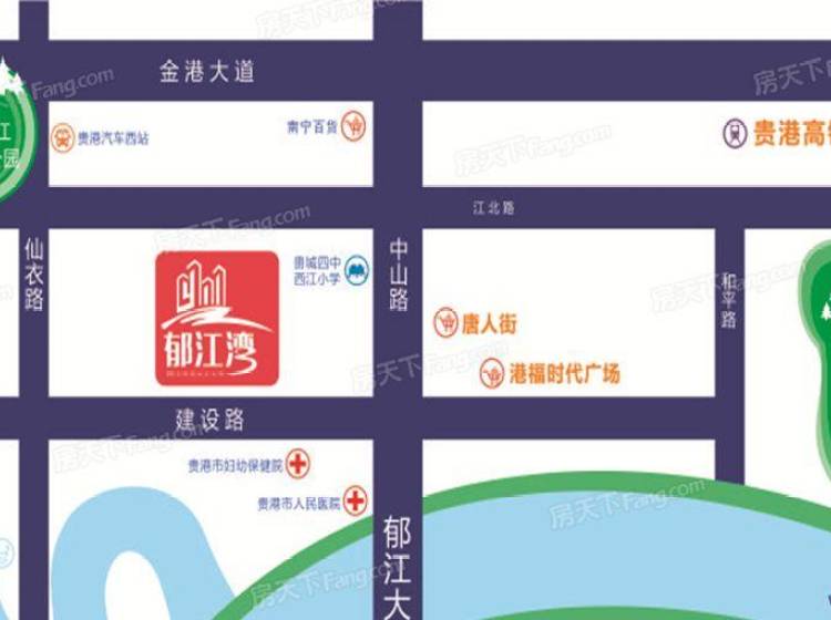 中小学:西江小学、贵城四中 综合商场:港福时代广场、唐人街、凤凰街 医院:贵港市人民医院、妇幼保健院 银行:交通银行、中国工商银行、中国银行 小区内部配套:幼儿园、商业街、运动场地、健身设施、游泳池