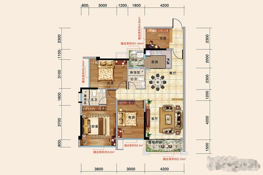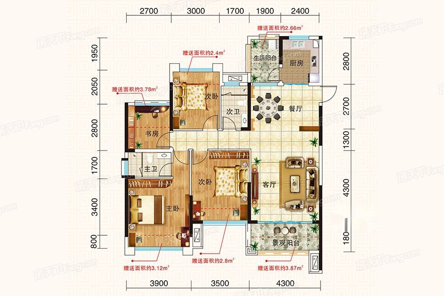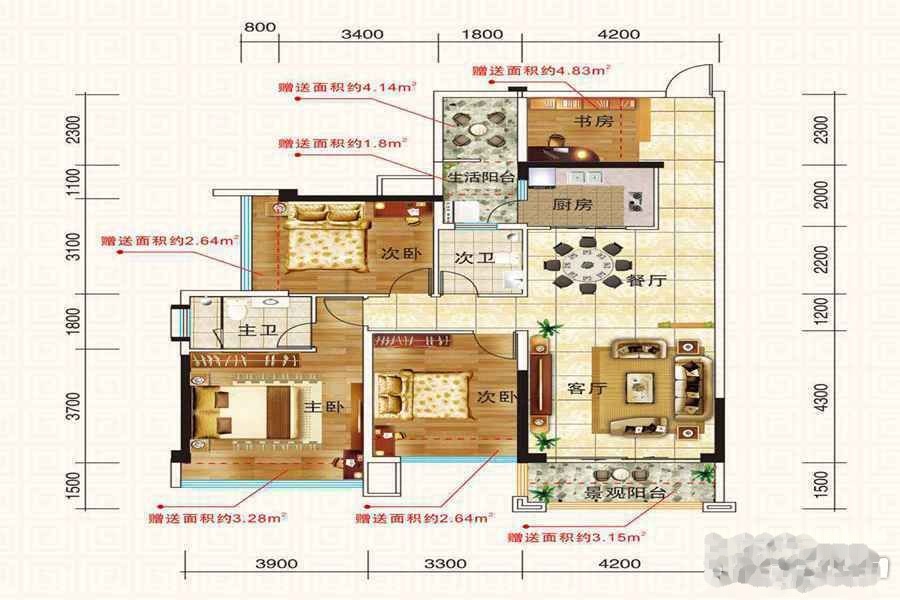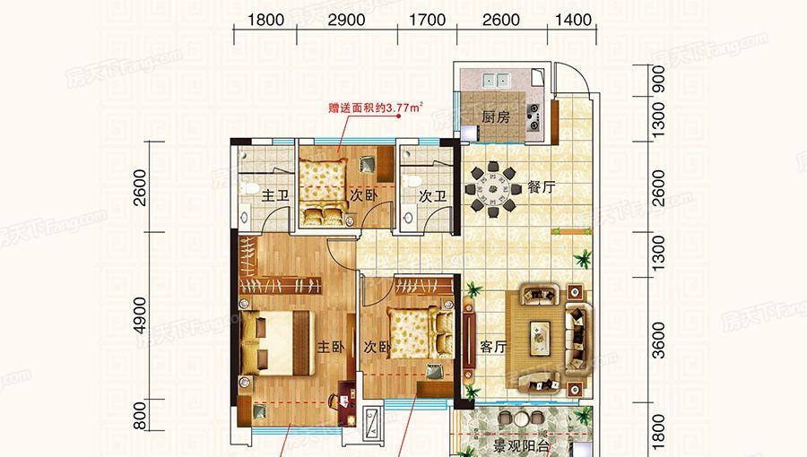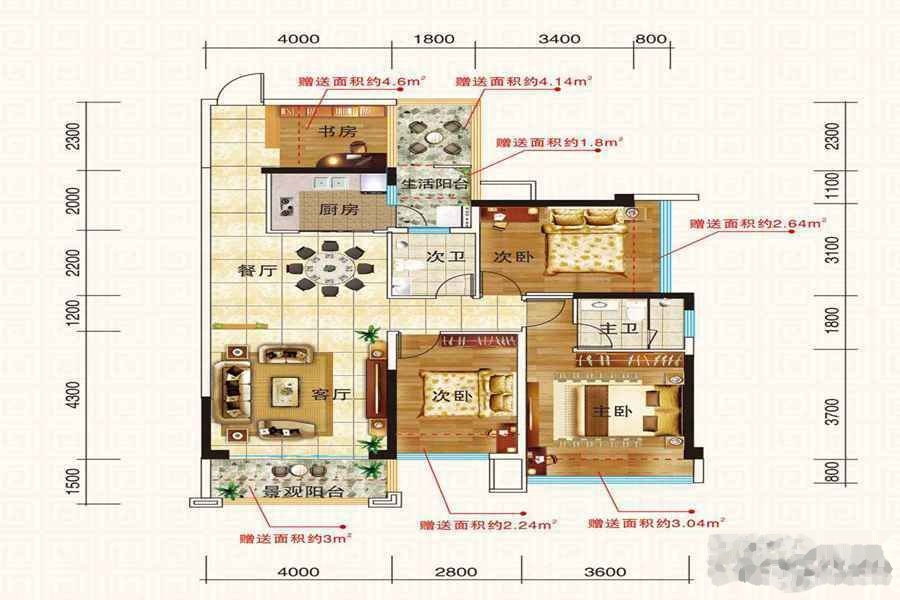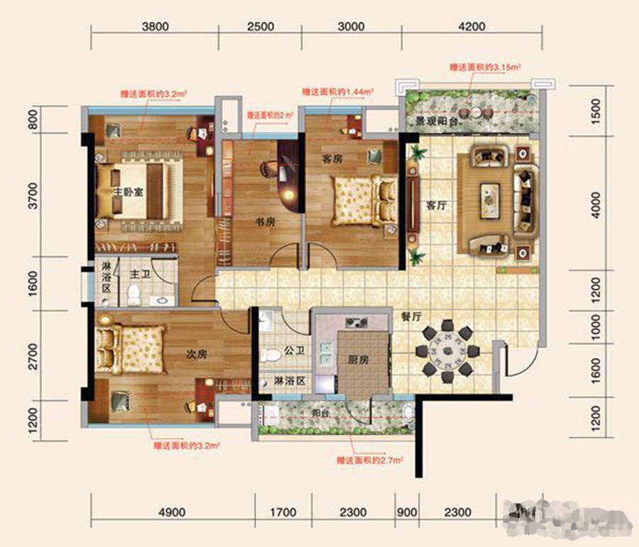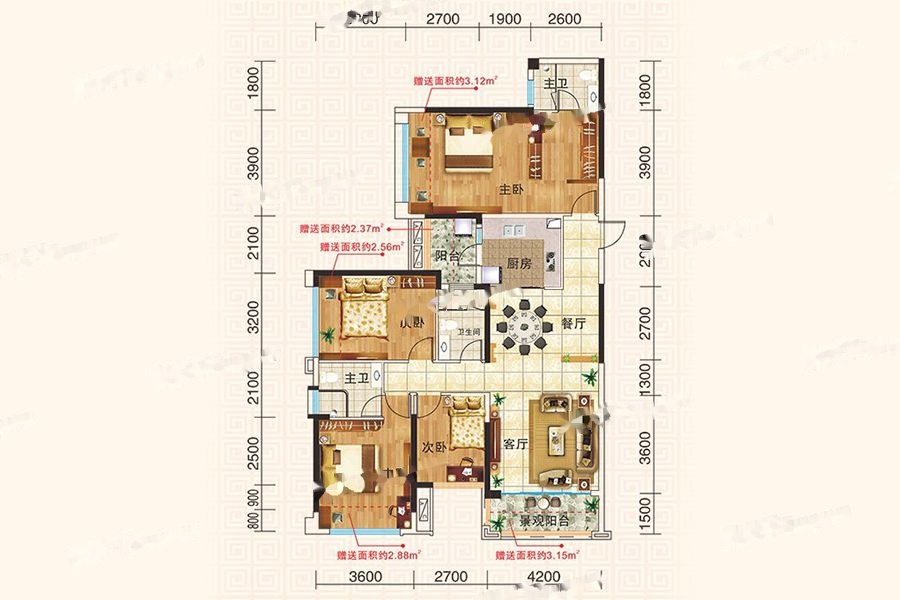 4室2厅2卫-8#楼01户型四房两厅两卫125.91㎡