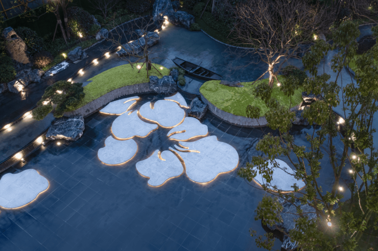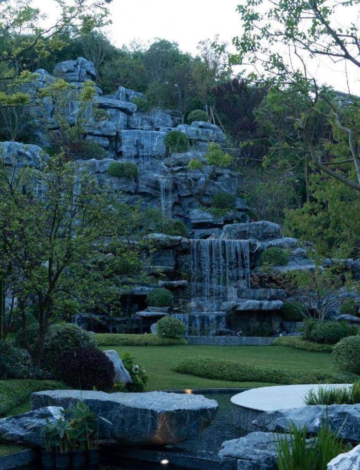 园林设计也独具匠心,借鉴恭王府的造景手法,打造“九桥十八景”,每一步都蕴含着归家的仪式感,“山水源溪”“山水飞瀑”的叠水与山石更是相得益彰。