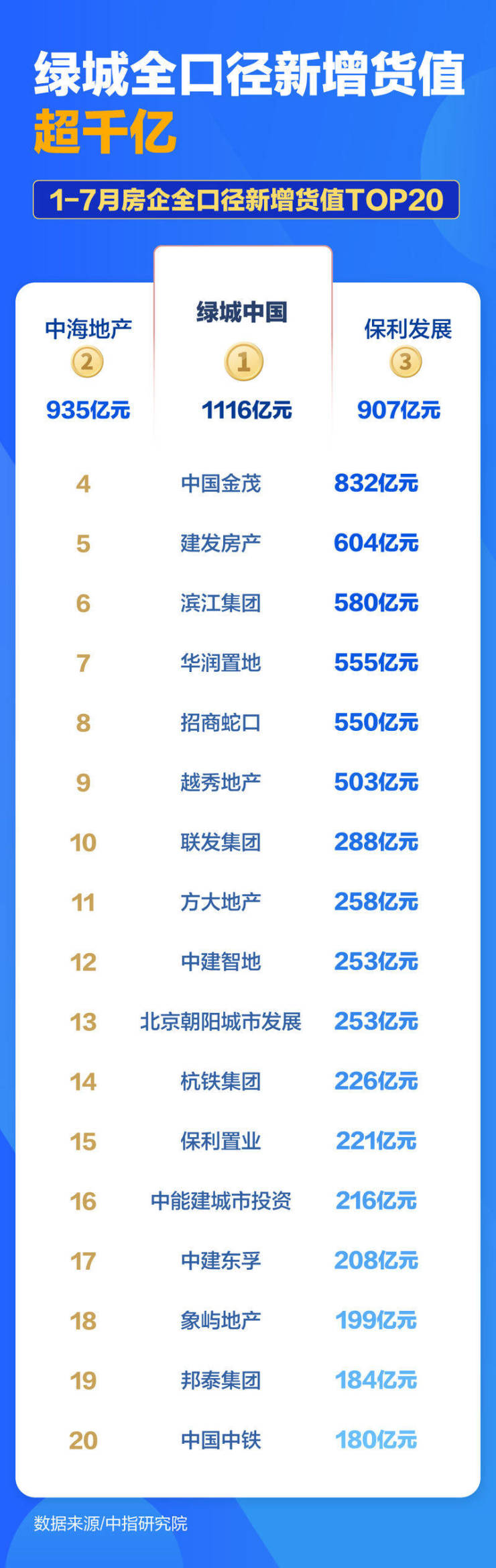 从新增货值来看,1-7月,绿城中国、中海地产和保利发展位列前三。绿城中国以1116亿元新增货值占据榜单第一,中海地产以935亿元新增货值位列第二,保利发展以907亿元新增货值位列第三。TOP10房企1-7月新增货值总额6871亿元,占TOP100企业的43.5%,头部企业集中度进一步提升。