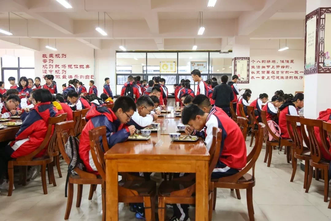 中学的食堂,老师和保安都与学生们一起就餐。