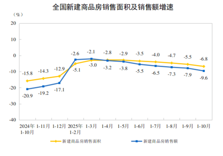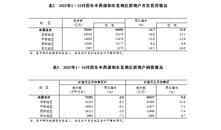 国家统计局数据显示,1—10月份,全国房地产开发投资73563亿元,同比下降14.7%;其中,住宅投资56595亿元,下降13.8%。1—10月份,新建商品房销售面积71982万平方米,同比下降6.8%;其中住宅销售面积下降7.0%。新建商品房销售额69017亿元,下降9.6%;其中住宅销售额下降9.4%。10月末,商品房待售面积75606万平方米,比9月末减少322万平方米。其中,住宅待售面积减少292万平方米。