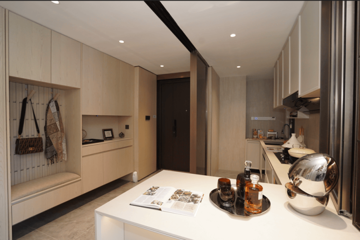 收纳场景预埋:以金茂棠系空间收纳体系设计为蓝本,从玄关、餐厅、厨房、卧室、卫浴五大需求场景出发,巧妙利用墙体厚度、转角空间等预埋对应收纳场景,实现收纳与美观的完美平衡;