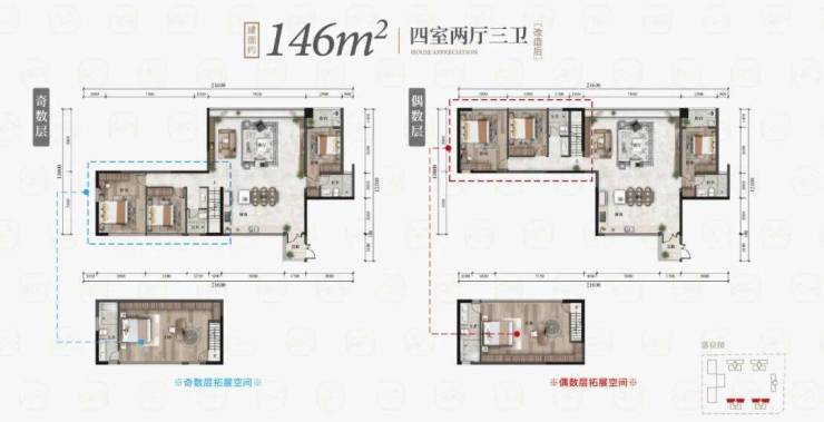 其中,99户型为三房两卫竖厅,但客厅开间尺寸超过6米,而146户型则为四房三卫双套房竖厅,客厅开间尺寸将近8米。