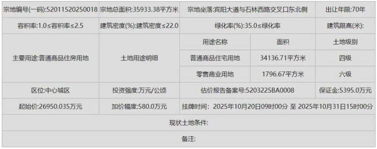 据悉,52011520250018号地块实际出让面积35933.38平米,其中普通商品住宅用地34136.71平米,零售商业用地1796.67平米,规划指标为容积率大于1.0小于等于2.5,建筑密度小于等于22%,绿地率大于等于35%;
