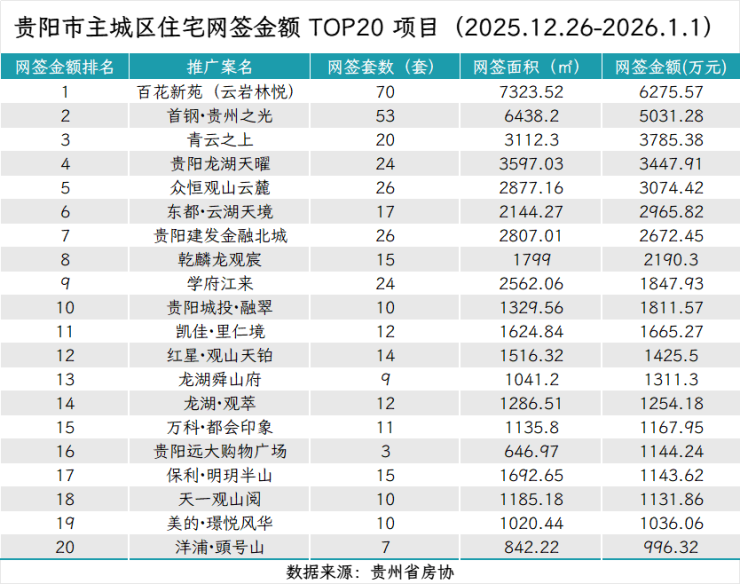 据贵州省房协统计数据,2025年12月26日至2026年1月1日,贵阳主城六区住宅网签金额榜单中:
