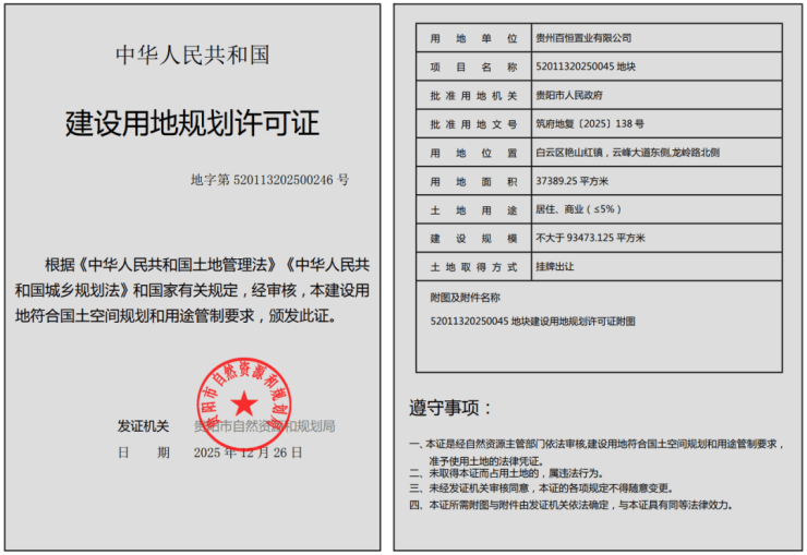 2025年12月30日,据贵阳市自然资源和规划局公示信息,52011320250045地块项目,即 白云区共大地块项目 ,已获取建设用地规划许可证。