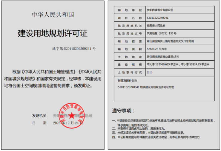 12月26日,据贵阳市自然资源和规划局公示信息,位于 观山湖区黔灵山路与贵遵路交叉口东北侧 的52011520240041号地块项目,已获取建设用地规划许可证。