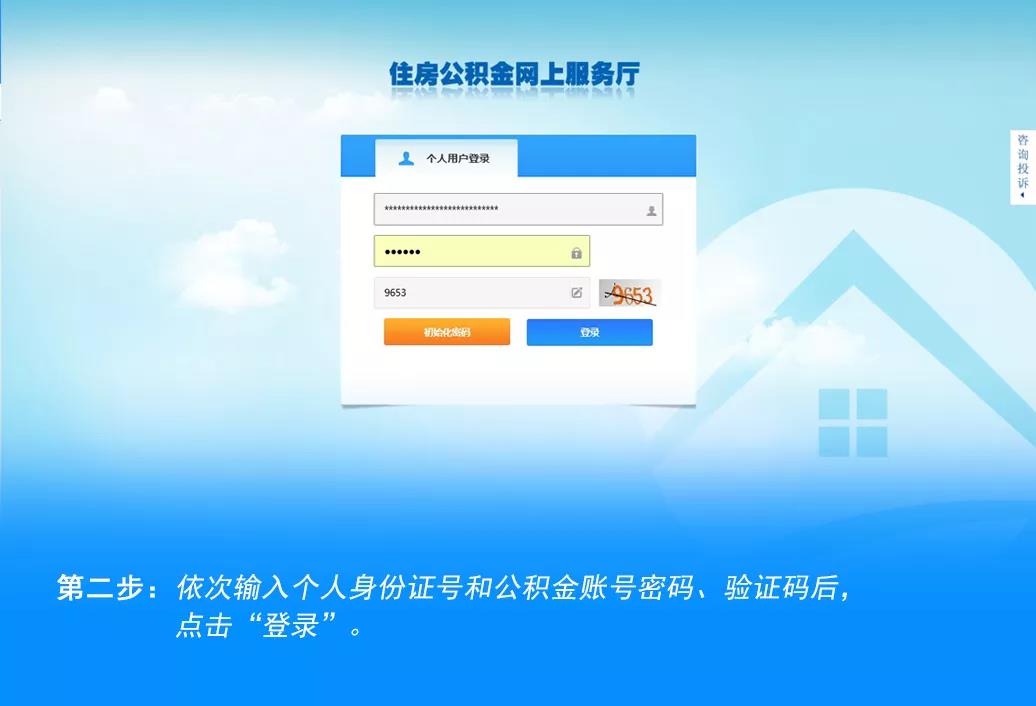 第二步:依次输入身份证号和公积金账号密码、验证码后,点击登录。