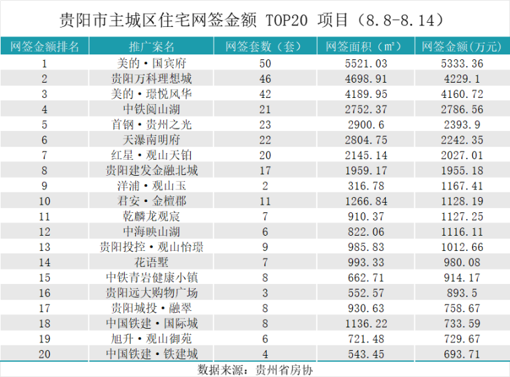据贵州省房协统计数据,2025年8月8日至2025年8月14日,贵阳主城六区住宅网签金额榜单中: