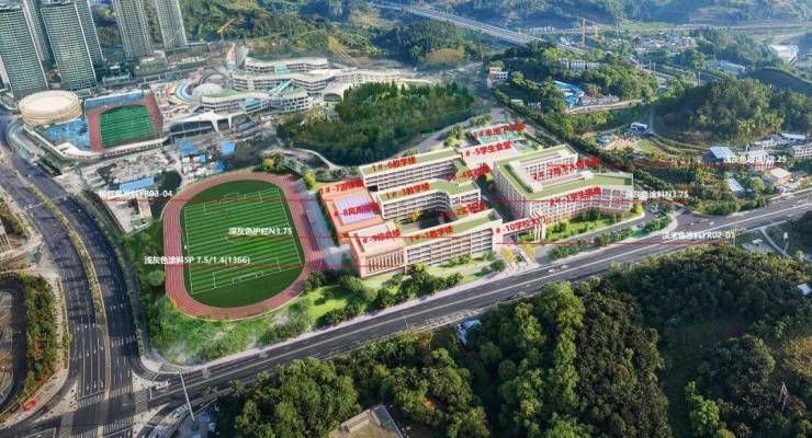 主要建设内容包含3栋教学楼、2栋实验楼、1栋综合楼,以及风雨操场、游泳馆、学生食堂、学生宿舍、地下车库等。